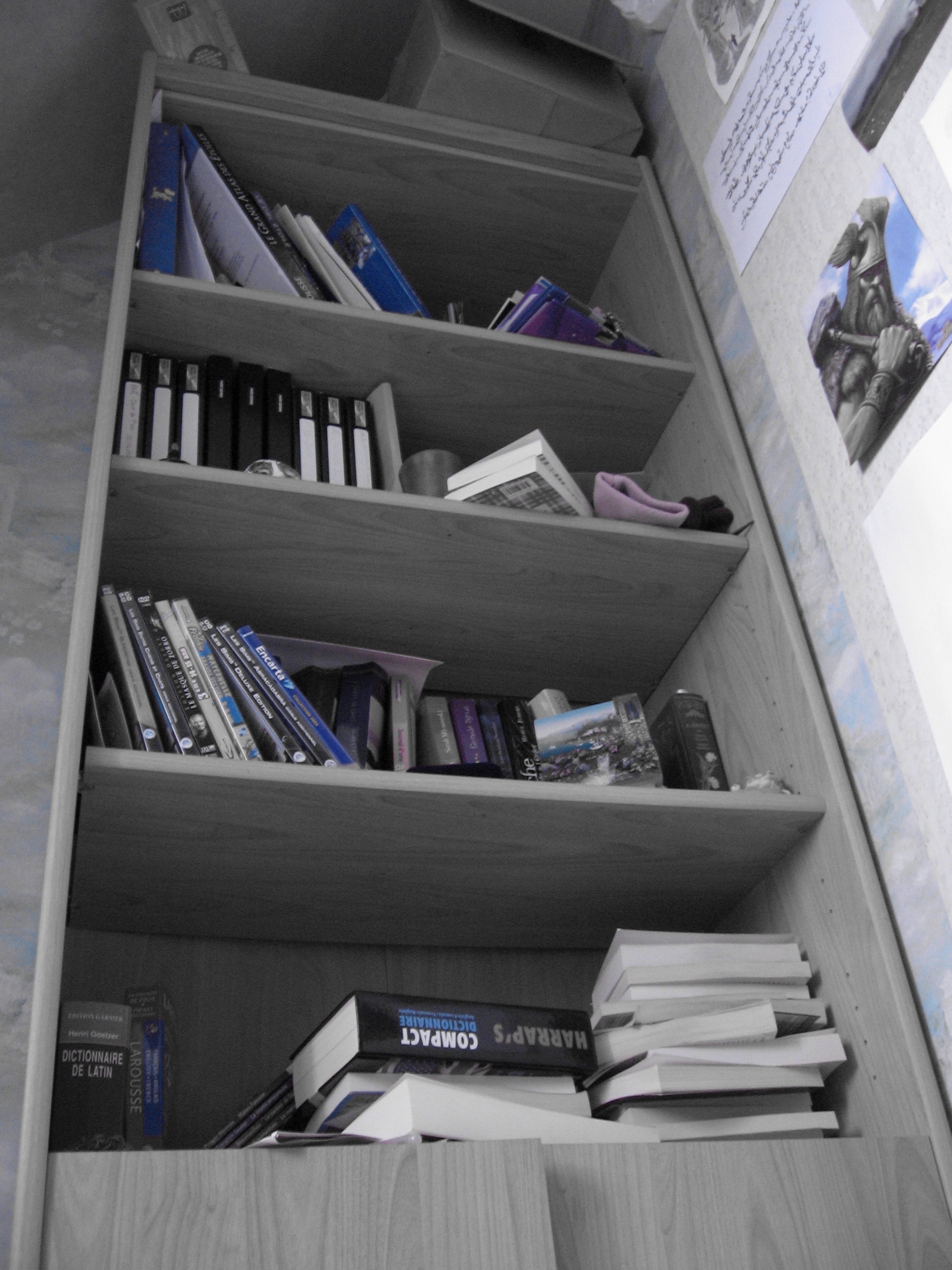 Me voilà prise d'une douce passion pour les vues "du bas" Voici ma bibliothèque ! Noir et blanc avec un jeu de calque bleu... Vous l'avez remarqué.