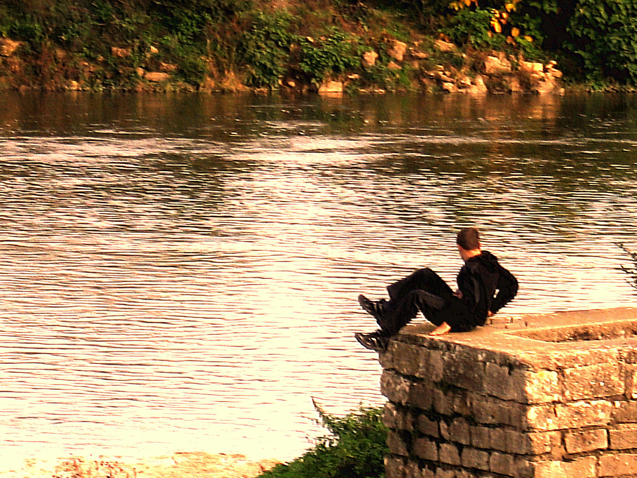 bord de Loire, France, on voit un homme assis sur un mur de pierre devant la Loire